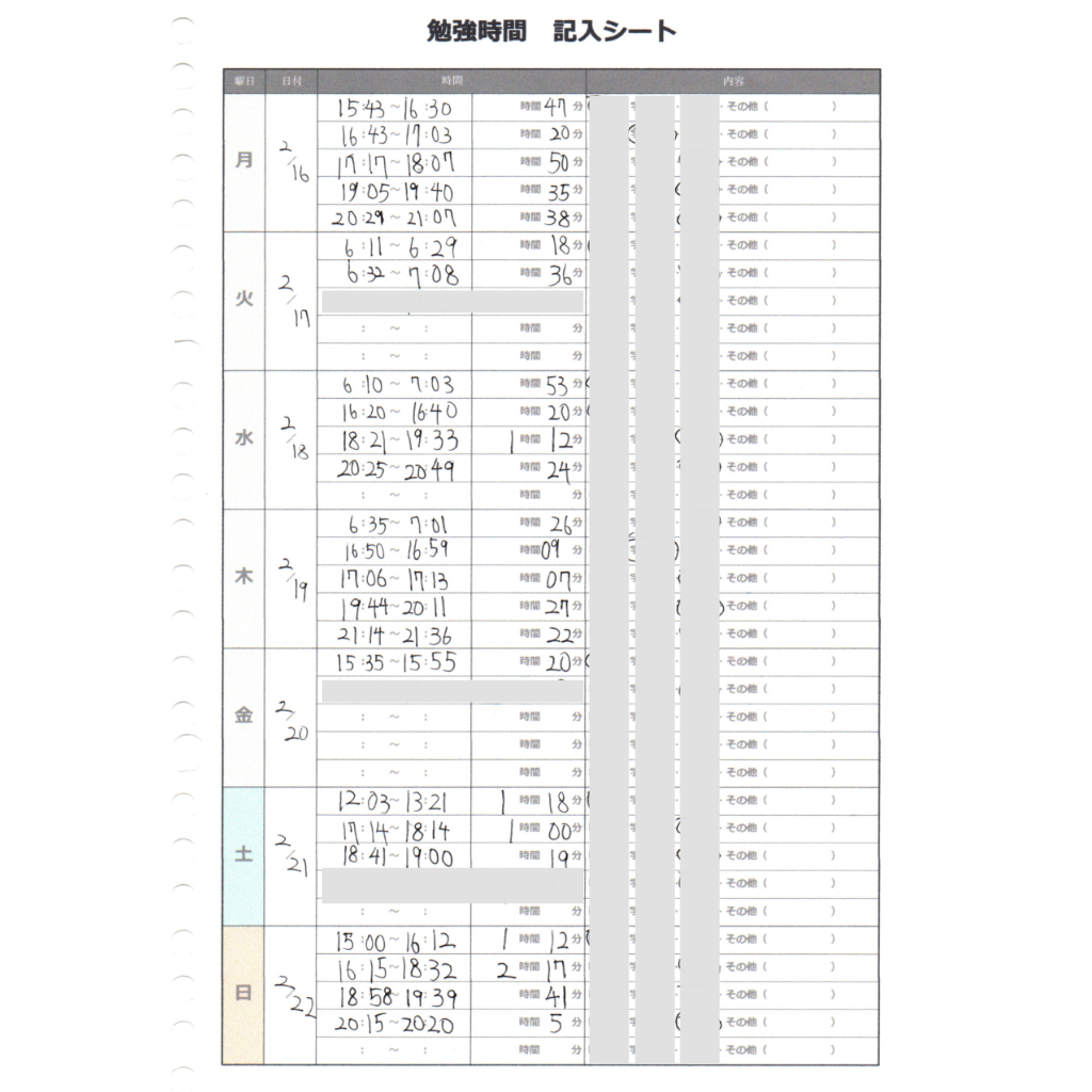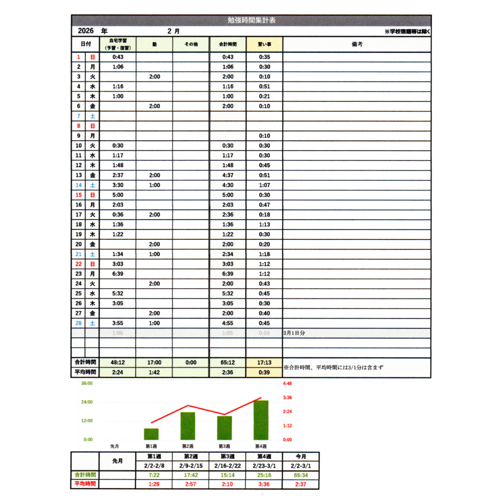実際の2026年2月分の「勉強時間集計表」はこちら。(※掲載用に一部内容を加工しています)